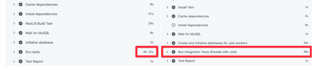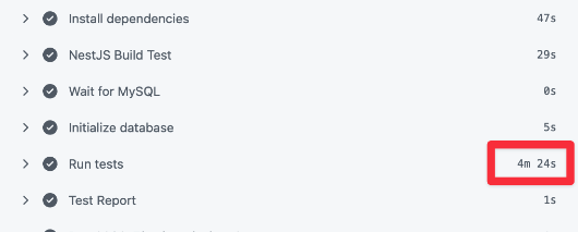 팀 합류 당시 부재했던 테스트 코드를 도입하기 위해 NestJS와 Jest 환경을 구축했습니다. 하지만 테스트 케이스가 늘어날수록 CI 스크립트 실행 시간이 길어져 배포 속도를 저하시키는 새로운 문제에 직면했습니다. 약 4분 30초에 달하는 대기 시간은 개발 생산성을 갉아먹고 있었습니다.
