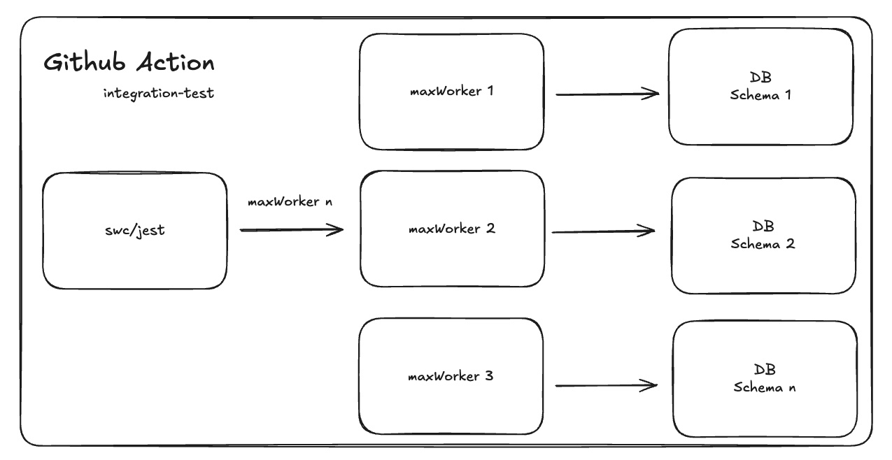 그 후 생각한 것은 jest의 maxWorker 옵션과 DB 멀티 스키마를 사용하는 것을 선택했습니다. jest의 워커 수만큼 DB 스키마를 동적으로 생성하고, 각 워커가 독립된 스키마에서 테스트를 병렬로 실행하도록 구성했습니다. 이를 통해 자원 효율을 극대화하면서도 테스트 간의 독립성을 보장했습니다.