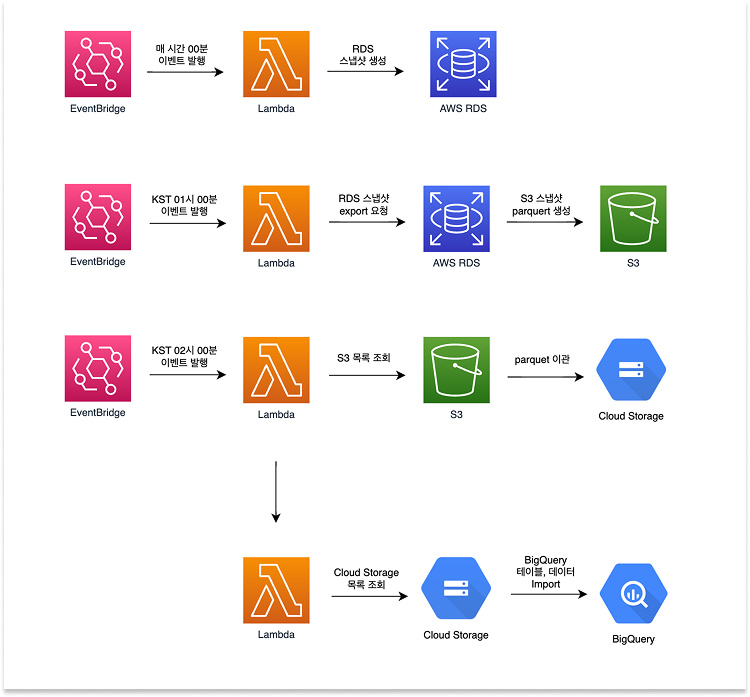 Step 4: 최종적으로 BigQuery에 데이터를 로드하여 일별 배치로 동기화되는 분석 환경을 완성합니다. 물론 step function을 사용해서 각 step 별로 실행이 끝나면 순차적으로 다음 단계의 lambda를 실행해도 됐지만, 빠르게 환경을 구축하기 위해 다음과 같이 lambda 활용 환경을 구성했습니다.